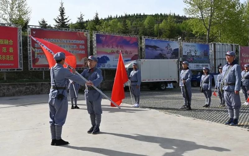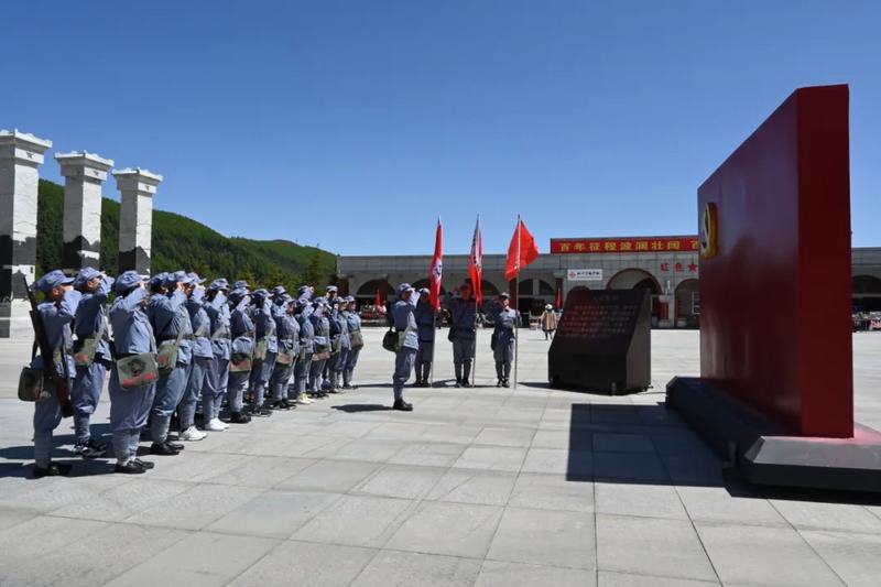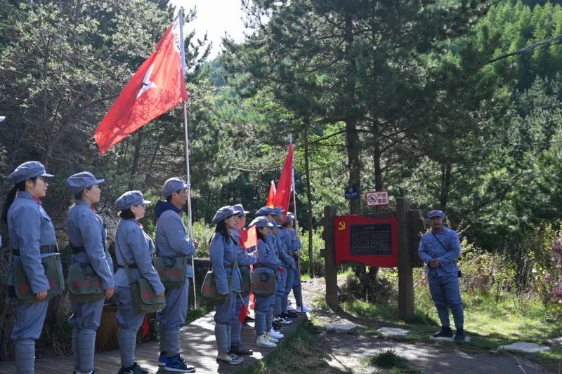 全體黨員懷著激動(dòng)的心情換上紅軍服、佩戴好黨徽,按照長征中紅一、紅二、紅四方面軍的編制分成三隊(duì)依次舉行授旗儀式,在大家齊頌毛主席詩詞《清平樂·六盤山》后,懷著對長征路的憧憬向山頂出發(fā)。