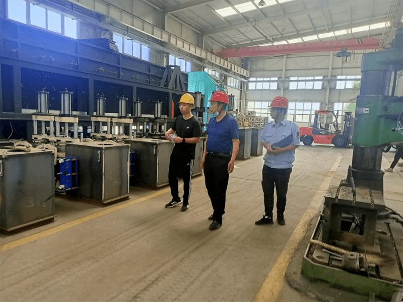 針對機(jī)械廠車間內(nèi)的安全隱患,王柱與安全員一一溝通,指出問題所在及解決的辦法,督促他們立行立改。